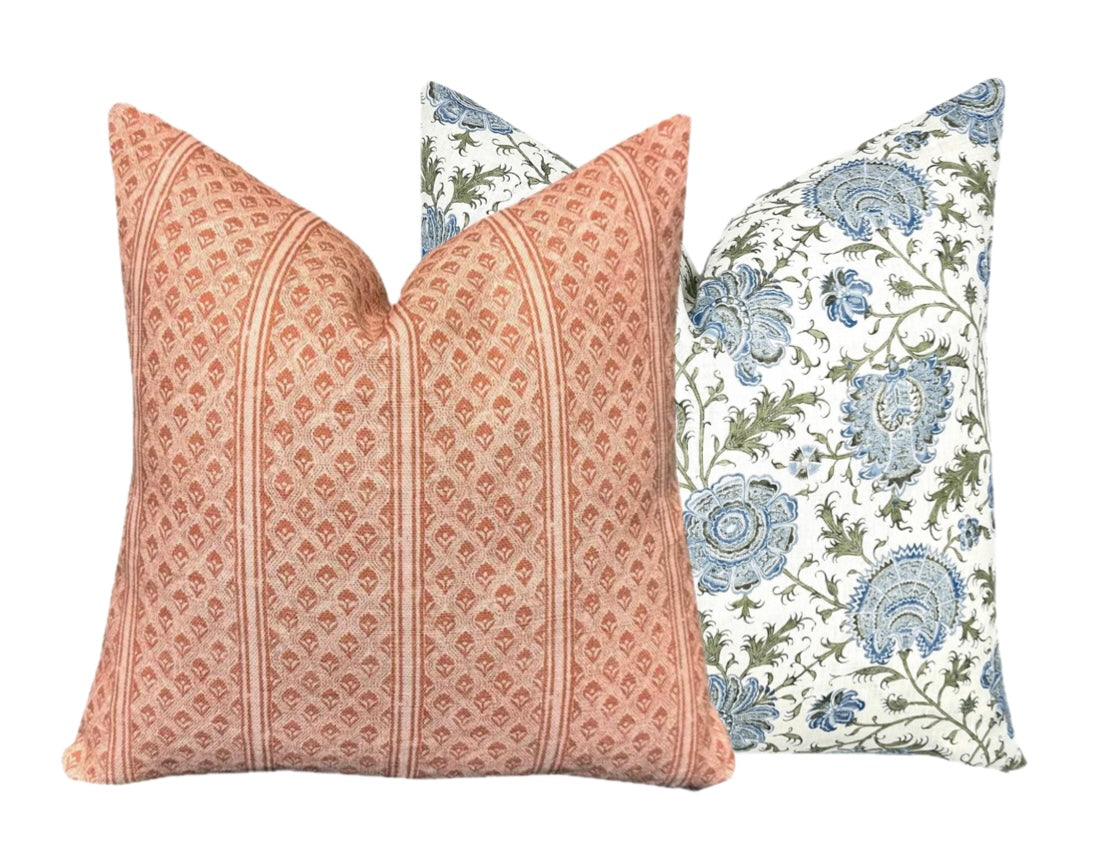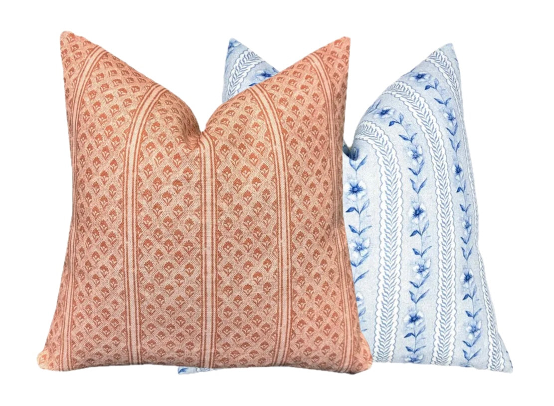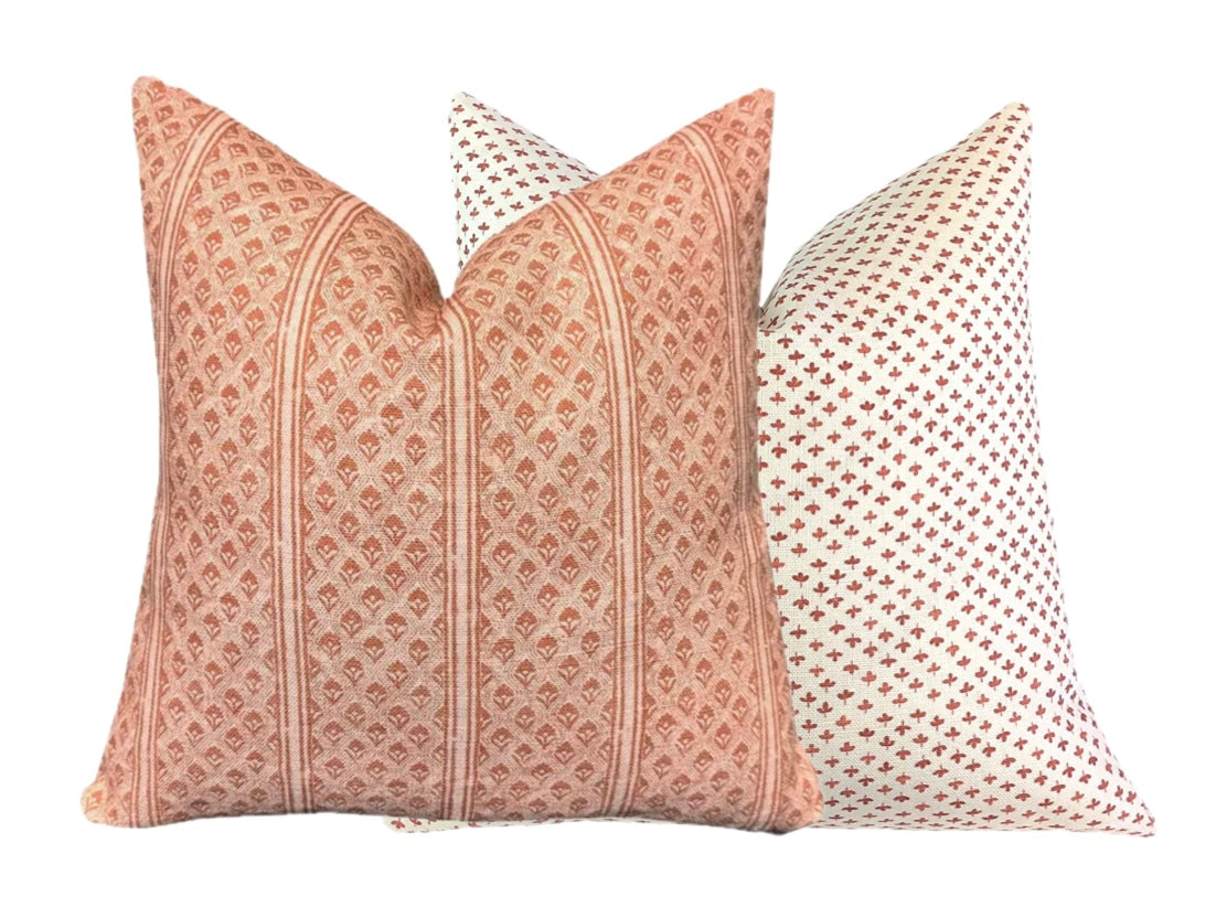Brynn Soft Rust Stripe pillow cover. Saturated light rust Stripe Linen pillow cover. Neutral. One Sided option features solid Ivory Linen. Knife edge finish. Subtle floral stripe. Soft Rusty Rose neutral tones that blend seamlessly across the color spectrum