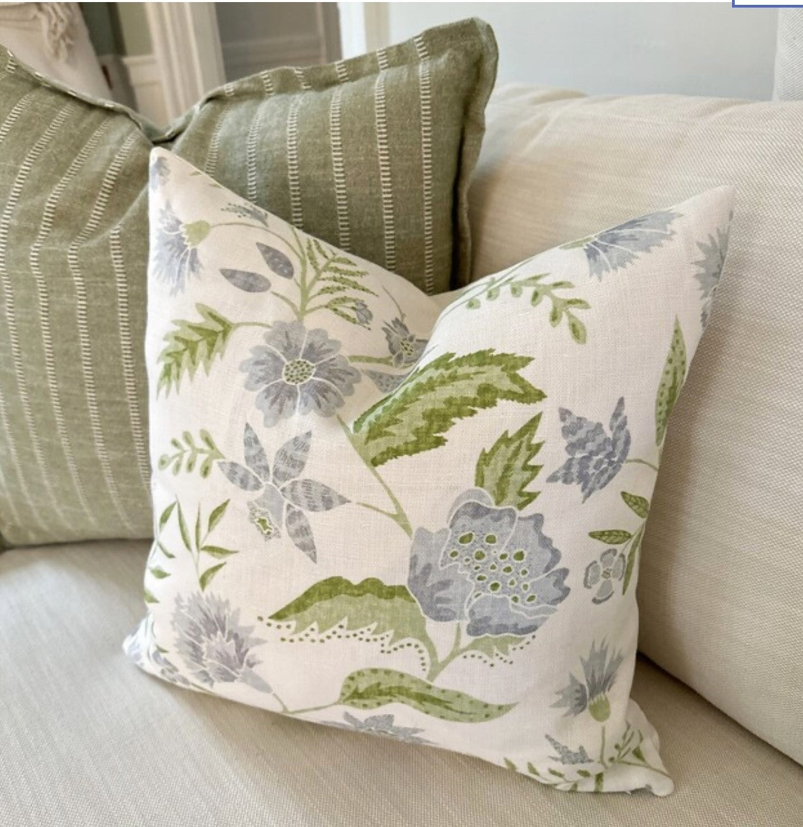 Kathy Vine Blue and Green Linen Pillow Cover | Designer | High End | Soft Sky Blue and Green on Off White Belgian Linen